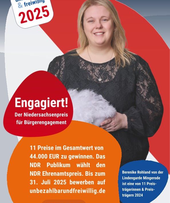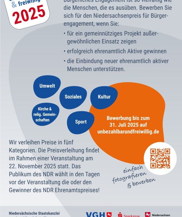 Mit dem Wettbewerb „unbezahlbar & freiwillig – Der Niedersachsenpreis für Bürgerengagement“, initiiert von den Sparkassen in Niedersachsen, den VGH Versicherungen und der Niedersächsischen Landesregierung, sollen diejenigen unterstützt und geehrt werden, die sich ehrenamtlich für unsere Gesellschaft einsetzen. Denn das Ehrenamt in Niedersachsen ist allgegenwärtig: Rund drei Millionen Menschen setzen sich in ihrer Freizeit für das Gemeinwohl ein – sie löschen Brände, leisten Erste Hilfe, engagieren sich in Sportvereinen, begleiten Menschen mit Beeinträchtigungen im Alltag oder setzen sich für Naturschutzprojekte ein. Die Möglichkeiten des freiwilligen Engagements in Niedersachsen sind breit gefächert und in nahezu allen Lebensbereichen möglich. Eines haben die verschiedenen ehrenamtlich Tätigen aber gemeinsam: Sie alle bereichern das Zusammenleben und den Zusammenhalt unserer Gesellschaft.
