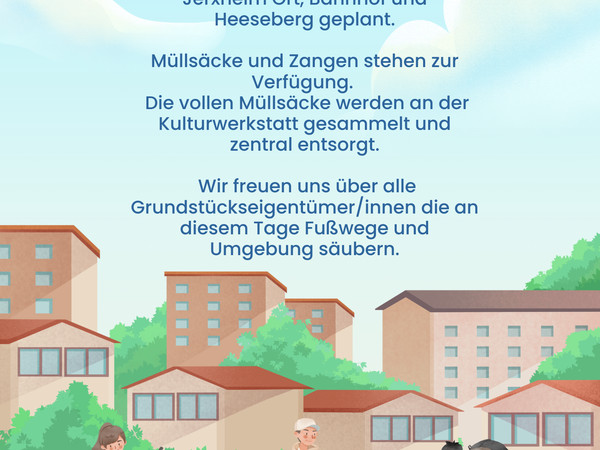 Geplant ist eine Aufteilung in kleine Gruppen, die in den Bereichen Jerxheim Ort, Bahnhof und Heeseberg unterwegs sind, um Wege und Umgebung von Müll zu befreien. Müllsäcke und Greifzangen werden an der Kulturwerkstatt bereitgestellt. Die gesammelten Müllsäcke werden anschließend an der Kulturwerkstatt gesammelt und zentral entsorgt.