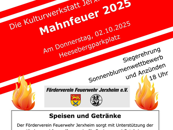 Am 2. Oktober lädt die Kulturwerkstatt Jerxheim zum traditionellen Mahnfeuer auf den Heesebergparkplatz ein. Beginn ist um 18 Uhr mit der Siegerehrung des Sonnenblumenwettbewerbes, bevor das Feuer entzündet wird.