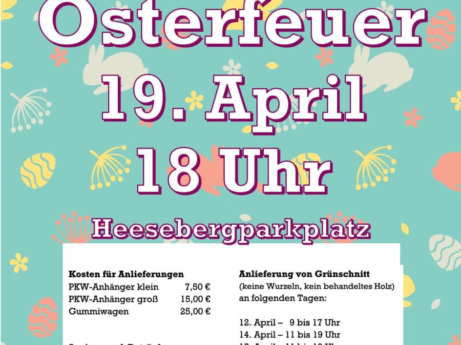Die Kulturwerkstatt Jerxheim lädt auch in diesem Jahr wieder zum traditionellen Osterfeuer ein. Am 19. April um 18 Uhr wird das Feuer auf dem Heesebergparkplatz entzündet, um gemeinsam mit der Dorfgemeinschaft das Osterfest zu feiern.